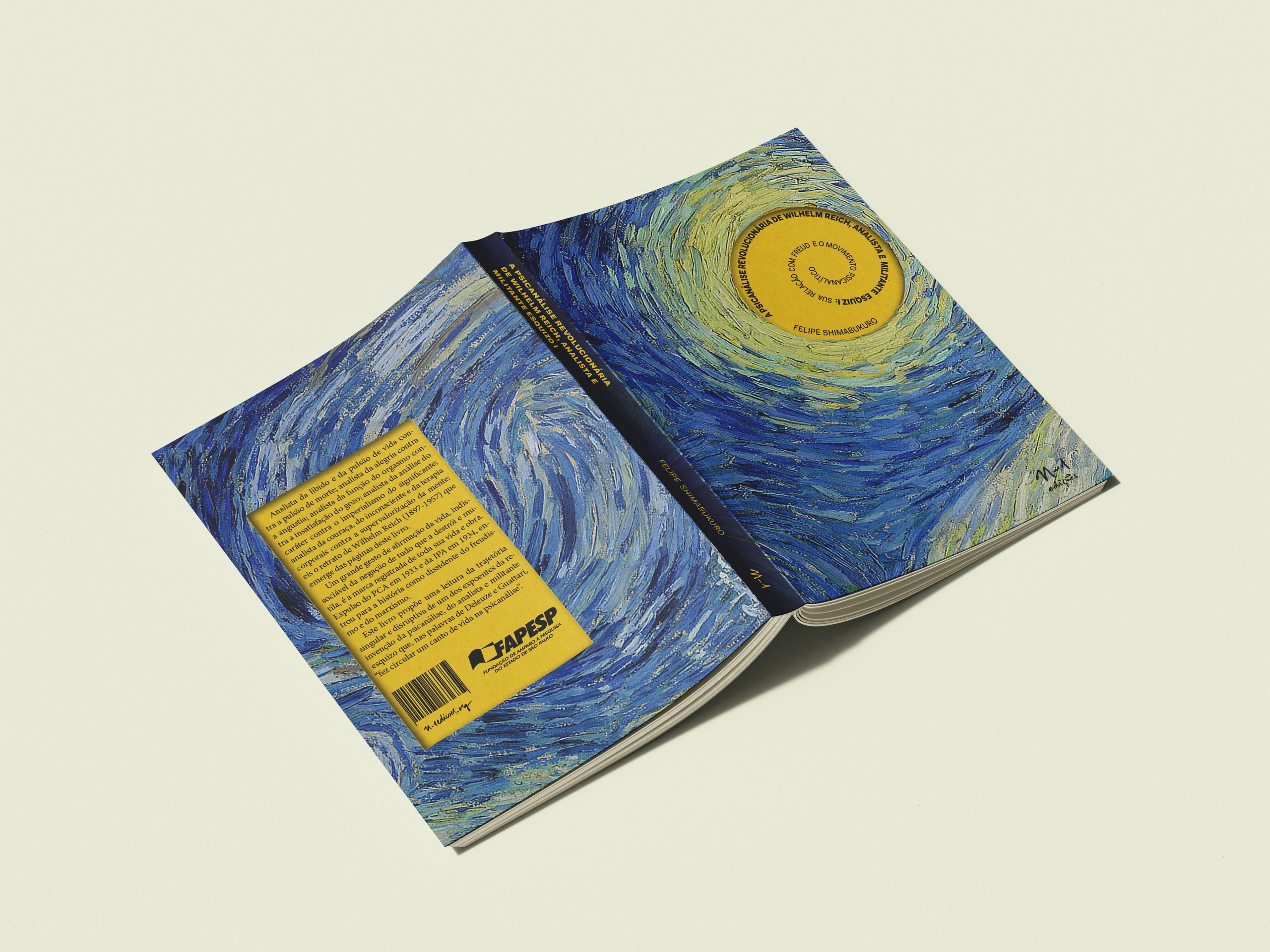 O desafio do projeto gráfico e da capa do livro "A psicanálise revolucionária de Wilhelm Reich", de Felipe Shimabukuro, era utilizar a imagem sugerida pelo autor da Noite Estrelada de Van Gogh. No caráter ondulado e azulado do quadro estaria uma bela manifestação do juízo esquizóide. A partir disso, trabalhamos com a ideia de espirais e cortes – realizando, inclusive, dois cortes na contra capa.